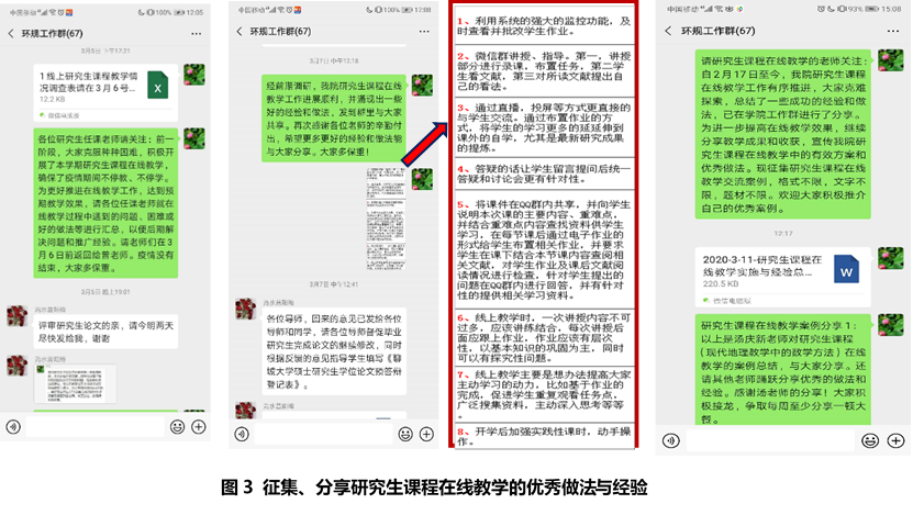通过在线教学培训和交流讨论,教师对在线教学逐渐由不熟悉到熟悉,同时也积累了一些做法和经验。为此,通过公司微信群和QQ群征集研究生课程在线教学过程中好的做法和成功经验,经汇总提炼后发送到公司工作群与大家分享(图3),激发了网络教学的兴趣和热情。