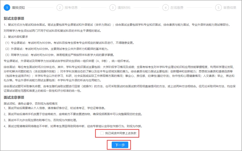第一步:阅读复试资格审查须知,阅读后勾选“我已阅读并同意上述条款”,然后点击【下一步】。
