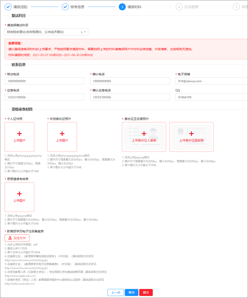 第三步:填报材料。首先选择复试科目,然后填写联系信息,上传审查材料的图片。上传后可以点击【暂存】,如果确认无误也可以直接点击【提交】,提交后无法修改审查材料。(需要填写的材料以实际页面为准)