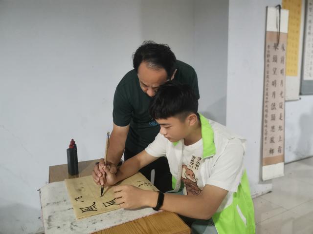 书法,承载着我国古老文明的过去与未来,发扬着汉字的艺术特色。兆魁艺塾,由国家级书法家崔兆魁先生于日照市创办。志愿者走进兆魁艺塾,映入眼帘的是一幅幅优秀的书法作品,浓郁的墨香扑面而来,再往里走,崔先生正伏案作书,志愿者上前向崔先生表达此次活动的目的,了解到志愿者此次前来的目的之后,崔先生欣然接受了志愿者想要了解学习软笔书法的提议,并从软笔书法的起源等开始了对软笔书法的讲解。一番简单讲解过后,崔先生让志愿者拿起毛笔,从握笔开始一步一步地教授志愿者如何使用毛笔进行书写,并根据志愿者的书写风格,拿出适合志愿者的字帖让其对照,进行临摹。崔先生见志愿者们对书法有着如此浓厚的兴趣,在临别时刻,将志愿者使用的毛笔赠与志愿者,希望其可以保持对于软笔书法的喜爱,勤加练习,将软笔书法发扬光大。