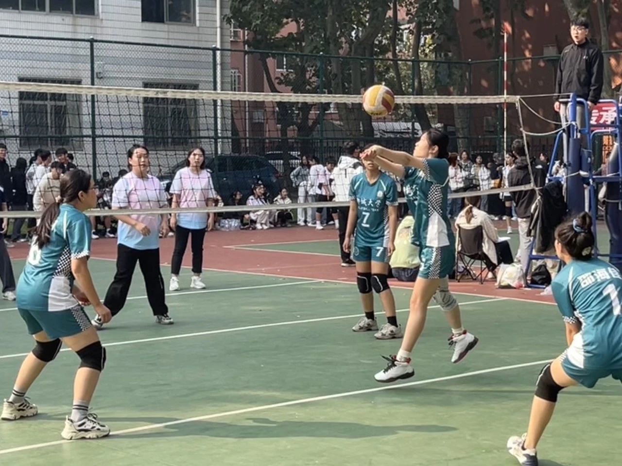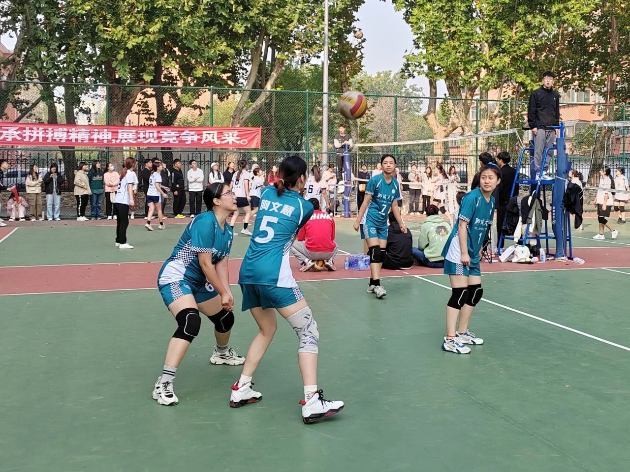 球不落地,永不放弃。比赛场上,排球队员们团结一致,配合默契,奋力扑救每一个球,不放弃任何一分的争夺。在与教育科学公司的比赛中,双方队伍咬紧比分,战况激烈,每一次精彩的传球与得分都引起观众们的欢呼阵阵。在大比分追至1:1平的情况下,公司女及时调整进攻战略,队员们充分发挥精湛的个人技术和熟练的战术配合,在比分胶着时率先突破困局,渐渐保持比分优势,排球赛现场同学们的连连喝彩助威也将赛场的气氛推向了高潮。最终,公司女排拼尽全力赢得这场战况持续了一小时十八分钟的比赛的胜利,进入到第一名的争夺赛。