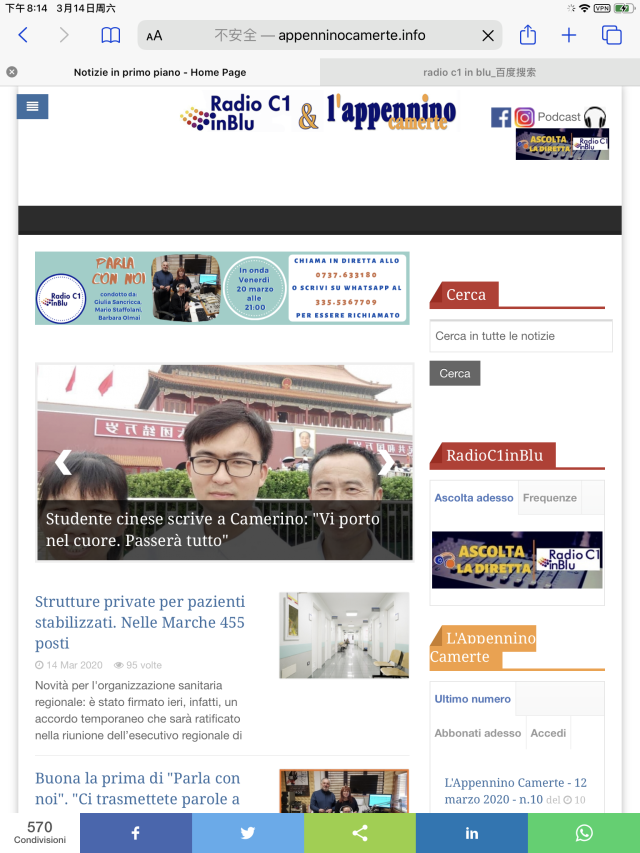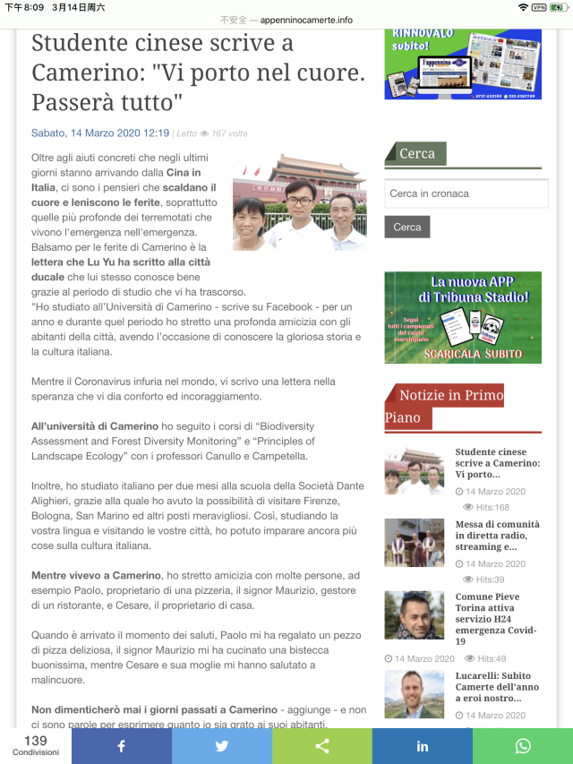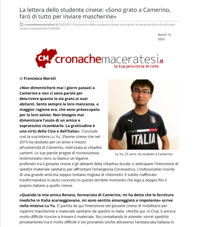 近日,中国新闻网一则题为“写信声援意大利走红的中国小伙:传递中国战疫经验”的新闻,报道了广州大学青年学子陆宇通过《致卡梅里诺人民的一封信》,产生强烈反响。陆宇同学为公司员工、环境与规划公司人文地理与城乡规划专业2013级本科员工,2015年公派前往意大利卡梅里诺大学留学,并与意大利人民建立起了的跨越国界的深厚友谊。