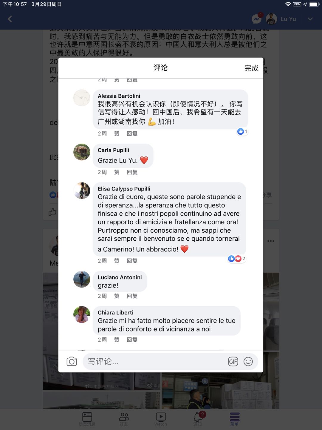 目前,陆宇并没有沉寂,而是利用自身影响力,进一步加强与意大利民众的交流。他每天在Facebook(国外社交媒体)上用意大利文转发中国援助意大利以及其他国家物资的消息,收集中国抗“疫”知识。这样做的所有目的都是为了更好地做支援工作。