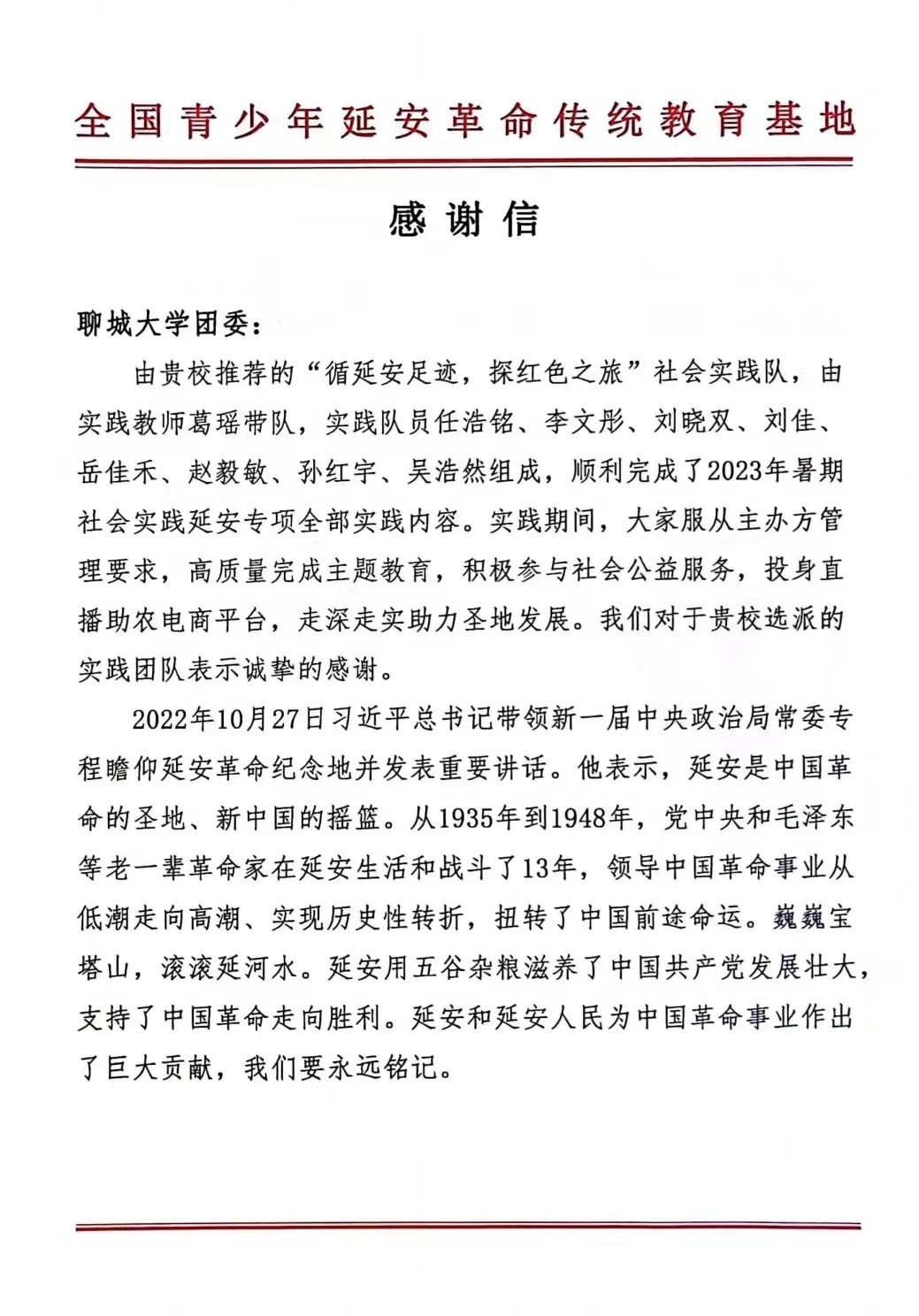 9月28日,全国青少年延安革命传统教育基地向HAHA体育团委发来感谢信,对公司“循延安足迹,探红色之旅”社会实践队在2023年暑期社会实践延安专项活动中的突出表现予以书面表扬和感谢。信中表示,实践期间,实践队成员积极参与社会公益服务,投身直播助农电商平台,走深走实助力圣地发展,高质量完成主题教育,充分展现出公司学子朝气蓬勃的精神风貌和积极继承发扬革命先烈精神的责任担当。