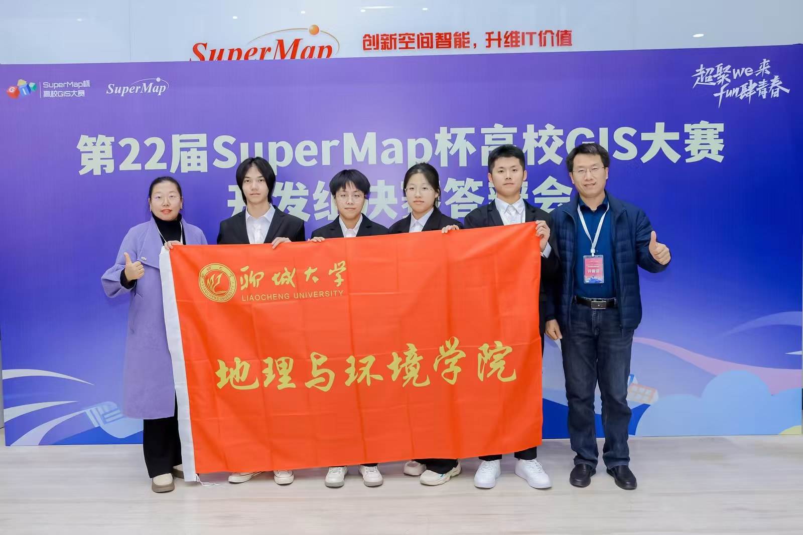 12月8日,在中国地理学会、中国地理信息产业协会主办,北京超图软件股份有限公司承办的第21届 SuperMap 杯高校GIS大赛中,沈巳晴、孙志敏、李鑫磊、付俊豪,在马雪梅、何振芳老师的指导下,巧妙融合“慧眼” 智慧监控识别系统,同时将三维模拟与智能反馈词云有机结合,打造“口袋公园共建共享平台 —— 以聊城市为例”,从全国100多组作品脱颖而出,在决赛中荣获二等奖。