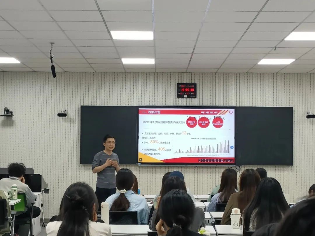 刘杰结合公司历届西部计划的志愿者服务经历,为毕业生解读了西部计划相关政策。首先,他介绍了西部计划服务的八个专项,包括乡村教育、服务乡村建设、健康乡村、基层青年工作、乡村社会治理、卫国戍边、服务新疆、服务西藏,让同学们对西部计划内容有了更加全面的了解和认识。其次,他解说了西部计划项目的报名条件、政策支持和生活保障,鼓励同学们结合自身实际选择未来发展道路,积极参与西部计划。最后,他对同学们提出的问题一一作了解答,排除了同学们的困惑。