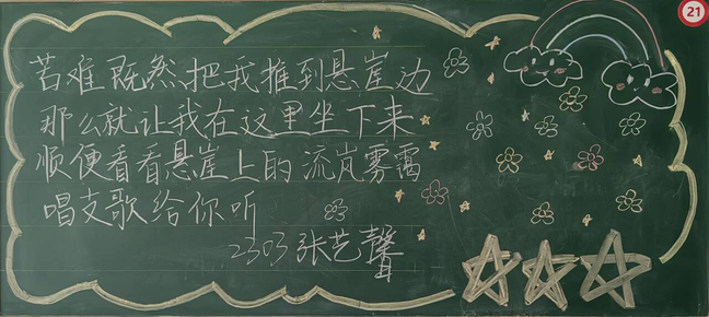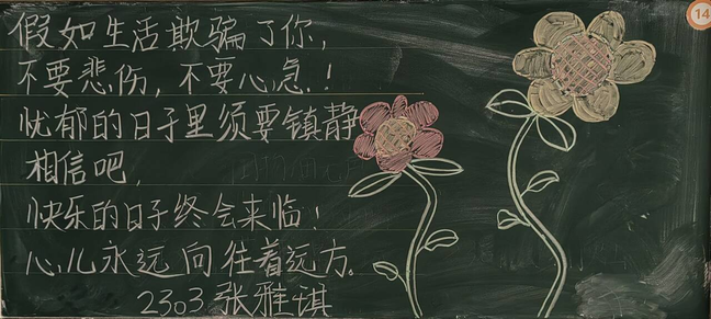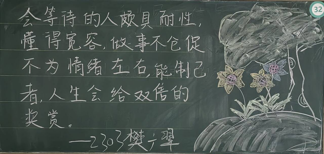 精彩纷呈的板书展现了同学们对传统文化的热爱和尊重,启发同学们对生活、自然和人生哲理的深层思考,展现了公司的活力与魅力,传递了公司的精神风貌,营造了积极向上的校园文化氛围。让我们携手努力,共同为打造更加丰富多彩的校园文化贡献力量!