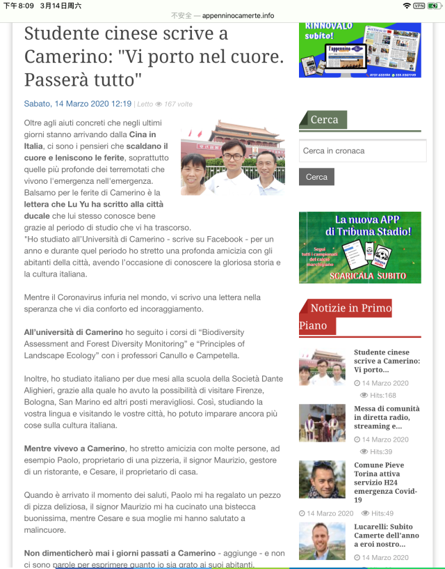 近日,中国新闻网一则题为“写信声援意大利走红的中国小伙:传递中国战疫经验”的新闻,报道了广州大学青年学子陆宇通过《致卡梅里诺人民的一封信》,产生强烈反响。陆宇同学为公司员工、环境与规划公司人文地理与城乡规划专业2013级本科员工,2015年公派前往意大利卡梅里诺大学留学,并与意大利人民建立起了的跨越国界的深厚友谊。
