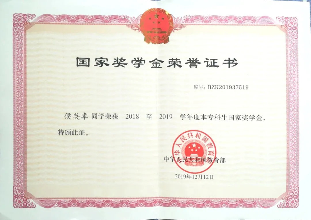 想为高考失误的争一口气以及为家人争一口气,这是曾支撑着他一直努力下去的信念,但是归根结底侯英卓还是想有一个充实无悔的老员工活。于是侯英卓就开始了学霸之路!得了许多奖项,比如2019年度十大优秀员工、校级优秀员工、共青团员标兵、校级优秀共青团员、国家奖学金,英才、一等奖学金等,国家级学科竞赛上获得过3项一等奖、2项三等奖等。