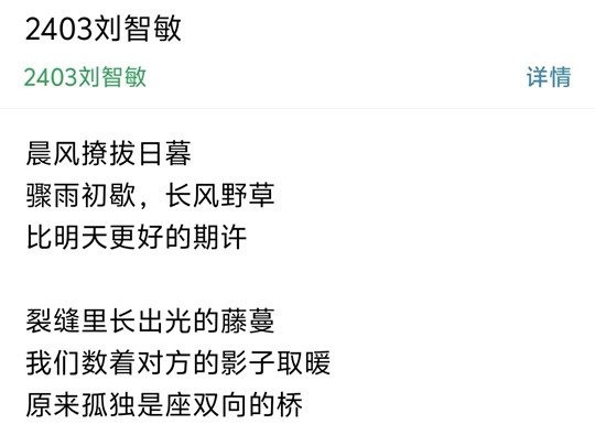 三行诗,以其简洁而富有张力的形式,成为情感抒发的绝佳载体。短短三行,既能是对生活细微美好的捕捉,也能是对人生哲思的凝练。无论是对过往的追忆、当下的感悟,还是对未来的憧憬,都能在这方寸之间得以呈现。此次“心灵回声”活动,希望参与者通过三行诗,将内心的情感转化为诗意的文字,与他人产生共鸣,让心灵的回声在诗句中荡漾。