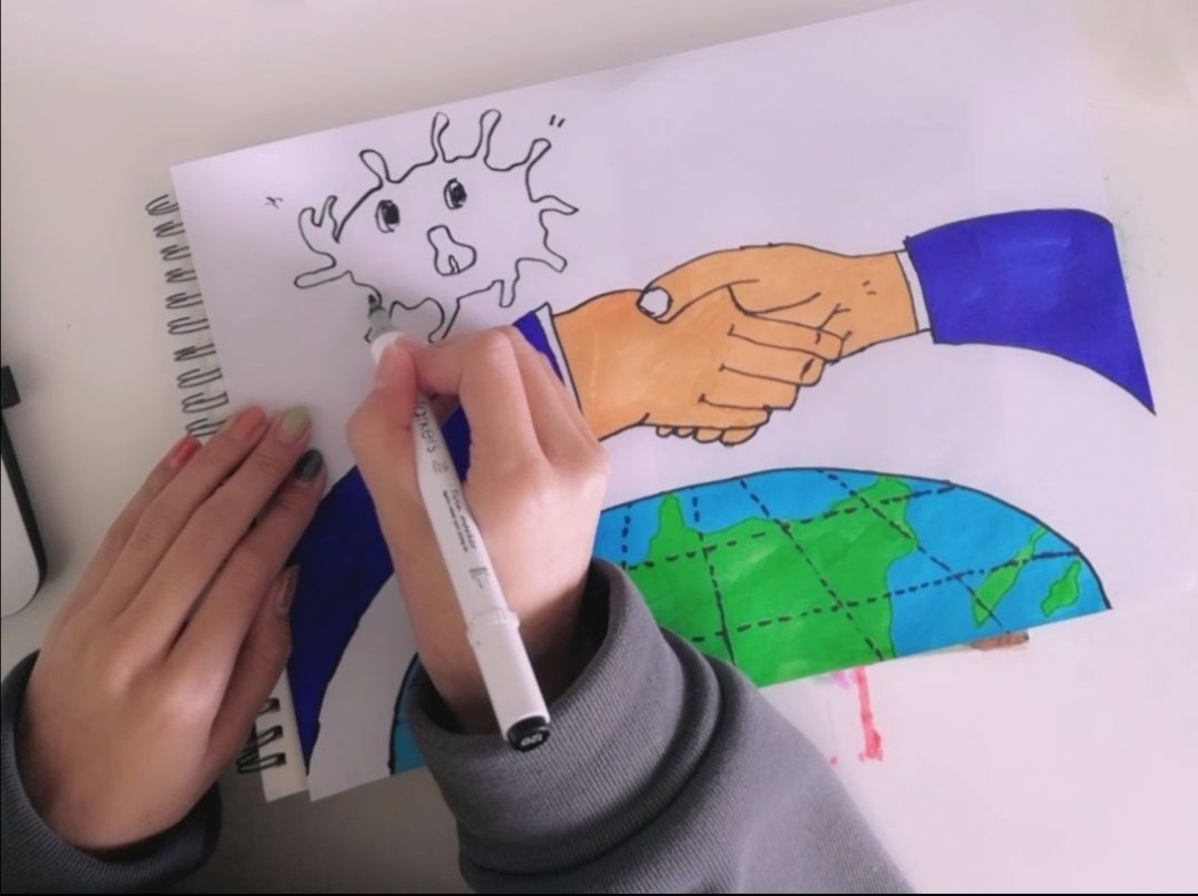 青山一道同云雨,明月何曾是两乡。活动以展现大国情谊为主题,采取线上征集作品的方式,要求原创作品以视频的形式上传。同学们踊跃参与,用彩笔勾勒图画,尽显中国助力全球战疫、加强国家交流的合作精神;用镜头记录瞬间,展现青年学子对祖国的自豪感以及对人类命运共同体的认同感。“投我以桃木,报之以琼瑶”,中国在最危难时刻世界各国倾囊相助,而面对全球疫情,中国更是携手奋战。其中,段荣荣同学的作品生动诠释了中国同全球共克时艰的无畏精神,为坚决打好新冠肺炎疫情防控全球阻击战贡献着中国智慧和中国方案,体现着大国情怀。