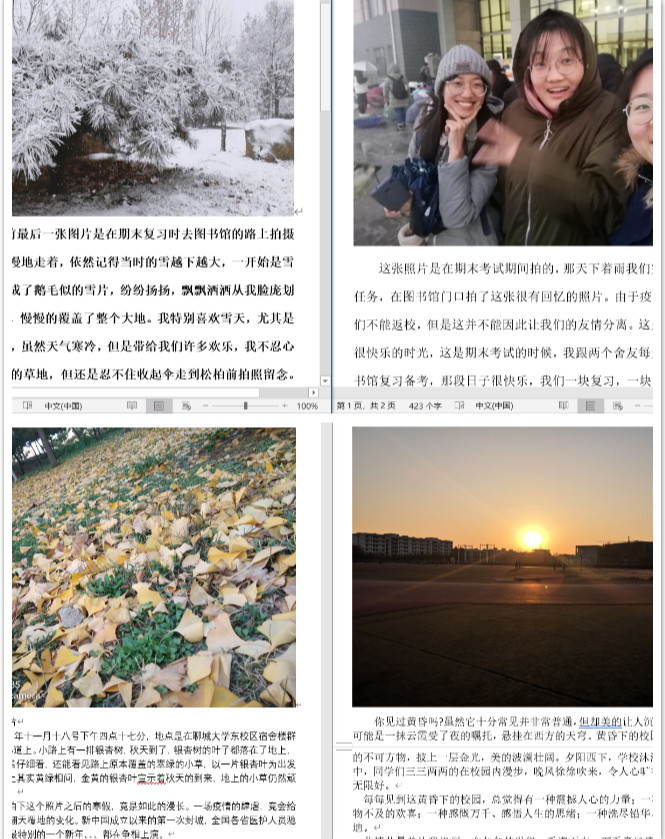 多日不见,甚是想念。居家五个月的时光中,校园里那闪耀夜空的彩虹桥,氤氲书香的图书馆,波光粼粼的季羡湖始终萦绕在聊大学子的心头从未消散。此次活动以“离校前的最后一片光影”为主题,要求参赛选手提交自己最后一张在校园里拍摄的照片,并讲述发生在此张照片背后的故事。活动发布后,环规学子踊跃报名参加,选手们一言一语,道尽了自己对于公司、朋友的想念。段绪萌为自己的作品起名为“时光”,看到自己与两位舍友冒雨行进的照片,回忆起自己与舍友们那段一起复习、吃饭、打水、逛超市的欢乐时光,只言片语中道出的是挚友间无尽的思念。经由评委综合评分,成俊荣、段念慈、段绪萌取得了此次活动的一等奖。