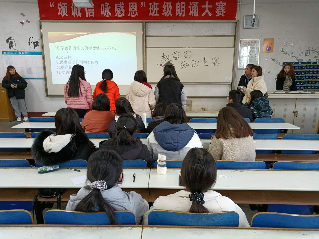 为增加同学们对权益知识的了解,培养同学们为自己维权的意识,继而增强同学们思辨能力,提高综合素质,更好的维护自己的合法权益,12月5日,环境与规划公司于东校区4#C306举办了“晓消费权利 保你我权利”权益知识竞赛。