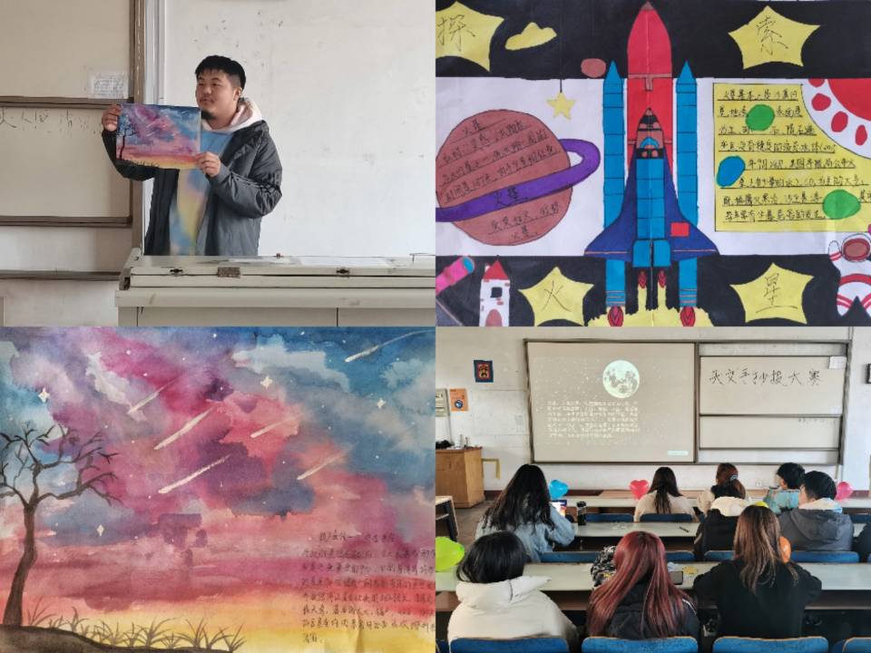 本次比赛围绕天文知识展开,旨在通过手抄报制作形式充分激发同学们在天文方面的兴趣,同学们广泛收集资料,精心设计手抄报板面,创作出的天文手抄报内容丰富、形式多样、构思独特。参赛选手按照抽签顺序依次上场,向评委们展示绘制的手抄报作品,并结合PPT,声情并茂地讲解手抄报内容。围绕“绚丽星空 探索天文”的主题,参赛选手们在规定的时间内详细地介绍了自己的作品,评委互相传阅每位参赛选手的作品,在认真聆听选手们的细致讲解后,对每份参赛作品进行打分记录。赛后相关负责人员在相关平台公布了获奖者名单,高振刚同学凭借精致的排版、优美的字体、各式各样的精美插图,加上色彩的合理搭配,荣获比赛第一名,活动取得圆满成功。
