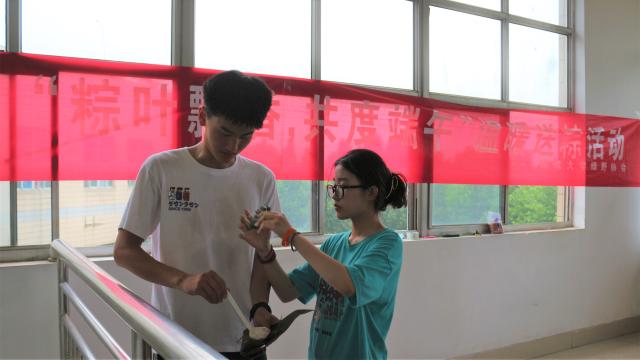 一岁一端午,一年一安康。活动开始前,同学们利用提前准备好的糯米、箬叶、红枣、花生等原材料,制作了多种不同口味的粽子。制作过程中,同学们认真学习包粽子的技巧,发挥自己的想象,推陈出新,将不同食材互相搭配,互帮互助,分工明确。餐厅的工作人员协助同学们将粽子煮熟。时风震向参加活动的同学们讲解了端午节的历史和屈原的事迹,简要介绍了屈原投江和粽子的由来,并指出了粽子特有的纪念意义,同学们认真聆听,受益匪浅。讲解结束后,同学们分成两组,分别将煮好装袋的粽子赠送给了餐厅的工作人员以及群星公寓的管理人员,活动取得圆满成功。