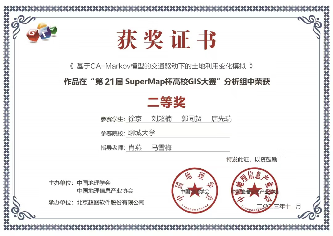 热烈祝贺哈哈体育徐京、刘超楠、郭同贺、唐先瑞同学获得第二十一届SuperMap杯高校GIS大赛分析组二等奖。此奖项的获得充分体现了徐京、刘超楠、郭同贺、唐先瑞同学的勤奋努力、艰苦奋斗,同时也为公司争得了荣誉。在此,向徐京、刘超楠、郭同贺、唐先瑞同学表示真挚的祝贺。