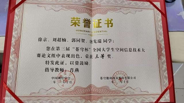热烈祝贺哈哈体育徐京、刘超楠、郭同贺、唐先瑞同学获得第三届“苍穹杯”全国老员工空间信息技术大赛论文组三等奖。此奖项的获得充分体现了徐京、刘超楠、郭同贺、唐先瑞同学的勤奋努力、艰苦奋斗,同时也为公司争得了荣誉。在此,向徐京、刘超楠、郭同贺、唐先瑞同学表示真挚的祝贺。