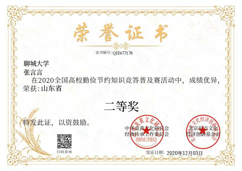 张言言在2020年全国高校勤俭节约知识竞答普及赛活动中获得二等奖