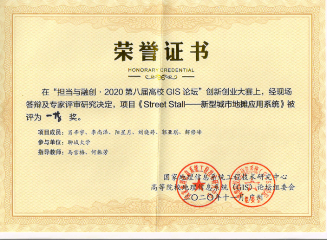 为提高科技创新意识,增强团体协作能力,2020年11月,环境与规划公司员工肖辛宇、李尚泽、阳星月、刘晓婷、郭亚琪、解修峰在马雪梅、何振芳老师的指导下,参加了2020第八届高校GIS论坛创新创业大赛,获得了一等奖,使其提高了科研能力,同时为日后的学习与创业实践提供了强有力的帮助。