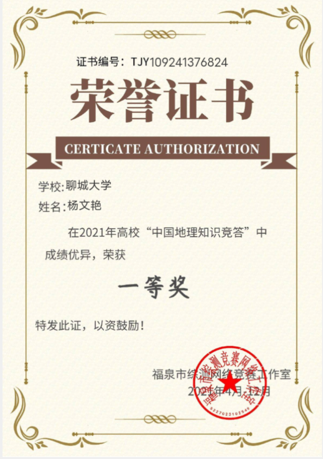 为更好的掌握专业知识,完善地理教学知识体系,2021年4月至12月,哈哈体育杨文艳参加2021年高校“中国地理知识竞答”,获得一等奖。