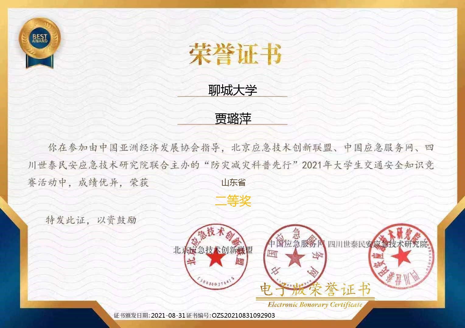 贾璐萍在“防灾减灾科普先行”2021年老员工交通安全知识竞赛中获得二等奖