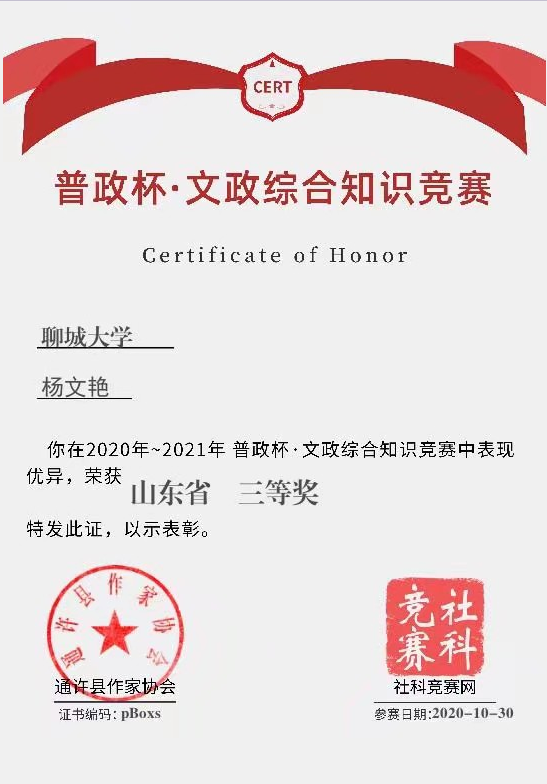 【下一篇】 杨文艳在“博古通今知识荟萃”文学竞赛中获得山东省优秀奖