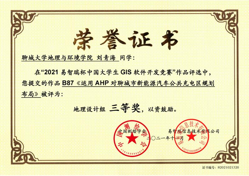 刘青海在2021易智瑞杯中国老员工GIS软件开发竞赛作品评选中获得三等奖