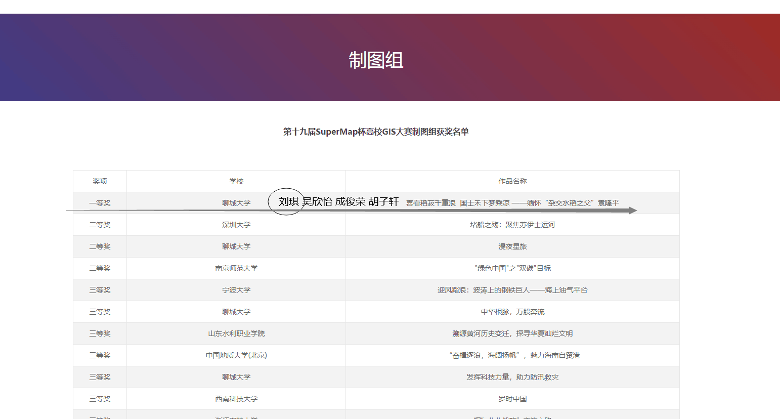 为提高科技创新意识,增强团体协作能力,2021年11月,刘琪、吴欣怡、成俊荣、胡子轩参加了第十九届SuperMap杯高校GIS大赛,获得一等奖。