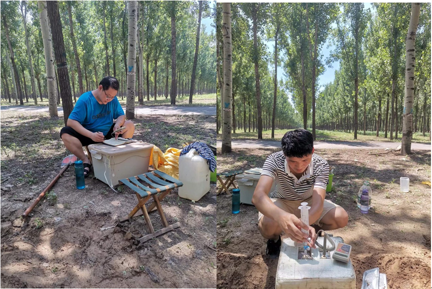 物质循环与全球变化研究小组的陶宝先老师带领研究生开展鲁西沙区林地温室气体排放的定点定时监测工作。不论春夏秋冬,这项野外定点监测和采样工作一直进行着。对于导师和研究生来説,必须充分利用假期这一黄金时段开展实验研究。