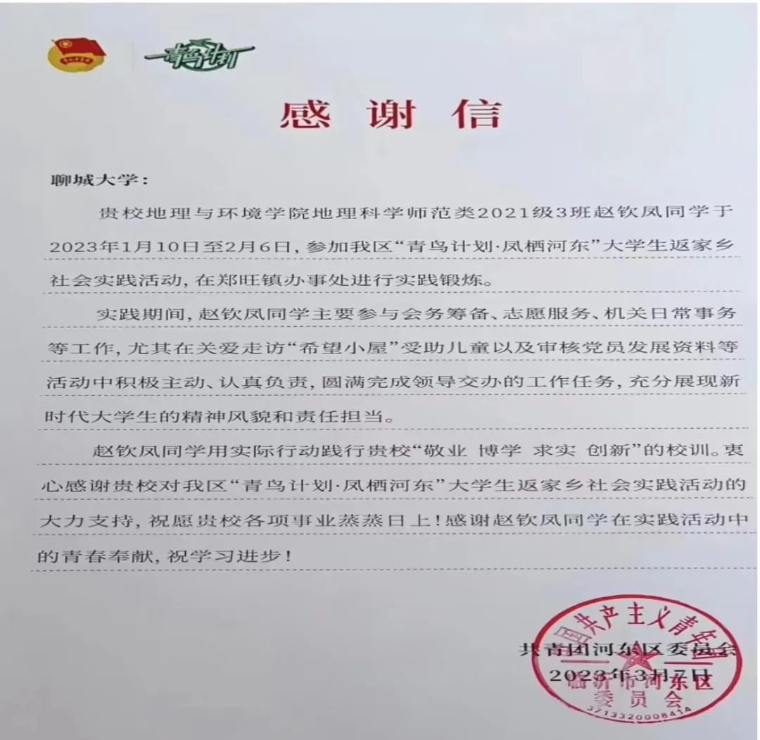 3月7日,临沂市共青团河东区委员会向HAHA体育发来感谢信,信中指出,哈哈体育员工赵钦凤在“青鸟计划·凤栖河东”实践活动期间,工作认真负责,甘于吃苦、踏实肯干,能够全心全意地投入到会务筹备、志愿服务、机关日常事务等实践工作中,展现了新时代青年的精神风貌和责任担当,对赵钦凤同学为家乡奉献的青春力量表达感谢。