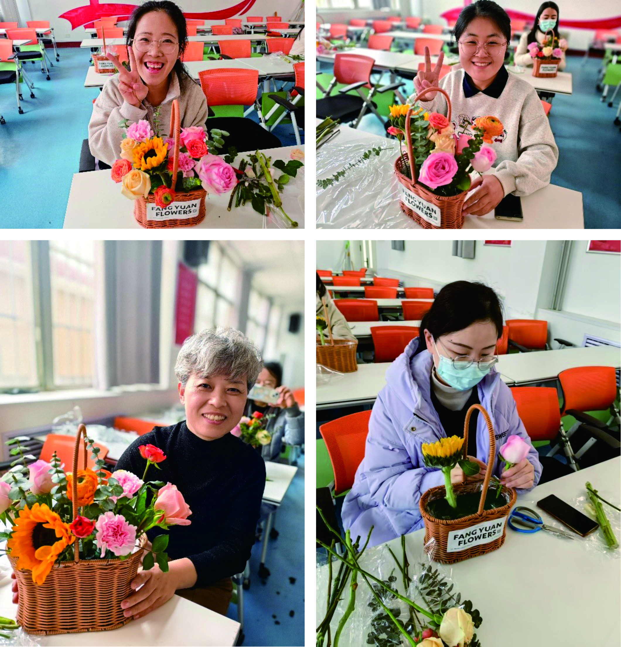 活动现场桌上摆满了康乃馨、玫瑰、向日葵等鲜花,花艺师从花材修剪、色彩搭配到造型技巧倾囊相授。女教师们化身“花艺达人”,手持剪刀轻剪枝叶,指尖翻飞间,一盆盆花篮逐渐成型。有人专注配色,有人探讨层次,欢声笑语中,花香与热情交织成最美的节日氛围。