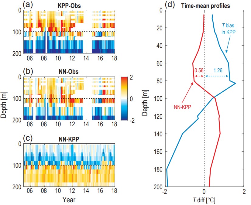 (a) 为目前海洋模式中采用基于物理经验关系的KPP参数化方案得到的赤道东太平洋温度模拟误差(0o,140oW); (b)为应用了基于神经网络(Neural Network, NN)新参数化方案后的误差;(c)和(d)为NN方法比 KPP方法的改善效果。结果显示60-80米的暖误差减小了约44%