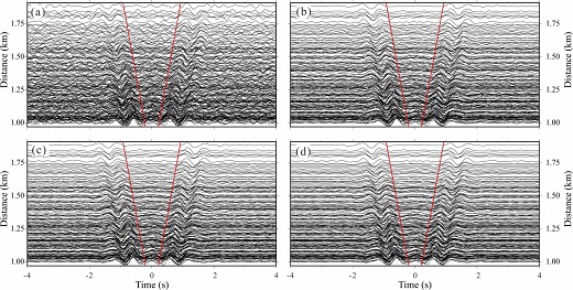 图1 (a)海洋中孤立岛礁1小时时长的噪声波形互相关结果;(b)12 小时时长的噪声互相关结果;(c)1 天时长的噪声互相关结果;(d)5天时长的噪声互相关结果。图中红线表示1.3 km/s的传播速度。