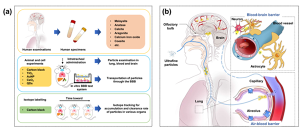 图 (a)整体实验设计示意图;(b)外源性细颗粒物经呼吸暴露进入大脑路径