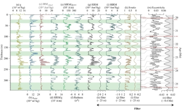 青藏高原中部的伦坡拉盆地(图1)沉积了巨厚的新生代河湖相地层,并含有大量的动植物化石和火山碎屑岩,近年来受到了国内外地质科学家的密切关注,成为高原研究的热点区域之一,是探讨高原隆升过程(例如古高度重建)及其生物、气候环境效应的关键区域。中国科公司地质与地球物理研究所新生代地质与环境院重点实验室沉积与地球环境学科组研究人员等利用环境磁学、岩石磁学和周期分析等方法对高原腹地伦坡拉盆地晚渐新世-早中新世(25.5-19.8 Ma)的河湖相沉积序列开展了综合研究,深入探究了该时期伦坡拉盆地的气候变化特征及其动力学过程。该研究获取了高原腹地首个轨道尺度的南亚季风记录,为探究高原隆升—季风形成的关系提供了来自高原腹地的直接证据。