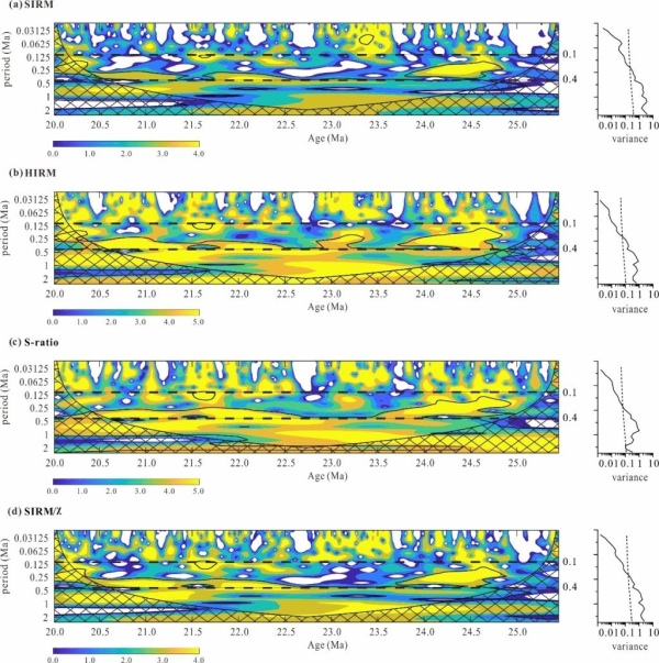 古气候分析发现,伦坡拉盆地25.5-19.8 Ma期间的气候变化具有明显的干-湿旋回特征(图2)。小波分析及谱分析显示干湿旋回周期约40万年(图3),与地球轨道长偏心率周期一致,表明偏心率驱动了该时期伦坡拉盆地的古降水变化。此外,前人对于青藏高原中部盆地(伦坡拉盆地、尼玛盆地)的多学科研究表明,晚渐新世高原中部的水汽来源主要是南亚季风而不是西风。因此,他们得出结论:偏心率通过南亚季风驱动了伦坡拉盆地晚渐新世-早中新世的古降水变化。这一发现不仅揭示了25.5-19.8 Ma期间南亚季风轨道尺度的演化,还表明南亚季风至少在晚渐新世强化,并北进至伦坡拉盆地。