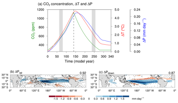 工业革命以来,化石燃料的大规模使用,导致具有温室效应的二氧化碳被大量排放至大气中,引起全球气候变暖。目前,研究多聚焦于二氧化碳浓度上升期的区域气候变化,而未来碳中和愿景实现后,当二氧化碳浓度开始下降时,已变化的气候会原路返回?热带降水作为全球能量和水份循环的重要环节,其空间分布的变化通过大气环流影响着全球的区域气候,而其在二氧化碳浓度上升和下降期的变化是否一致?背后是什么过程主导其在上升和下降期的变化?