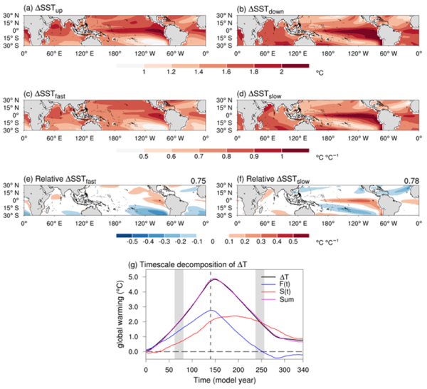 图2.理想CO2强迫试验(1pctCO2和1pctCO2-cdr)在CO2浓度(a)上升期和(b)下降期增温2 ℃时的热带海表温度变化,(c)快响应和(d)慢响应的热带海表温度变化及去掉热带区域平均后的(e和f)相对海温变化,(g)快响应(蓝色)和慢响应(红色)以及两者之和(品红色)对全球平均增暖(黑色)的贡献曲线。