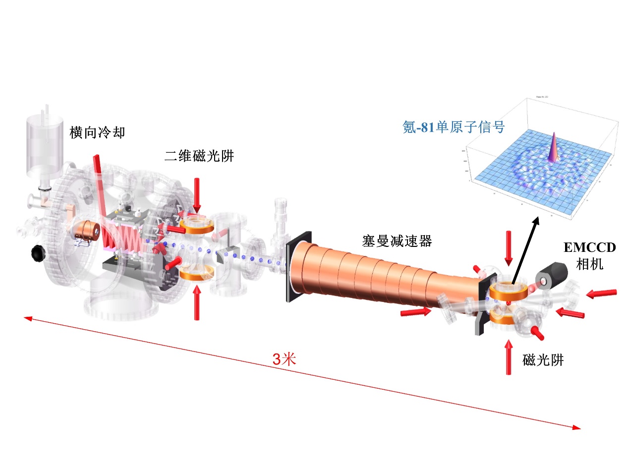 然而检测它们并不容易。“想想一公斤冰,”中科大蒋蔚教授说,“其中只有大约2000个氪-81原子”,这对应着9×10-13的微小同位素丰度——其探测难度类似于在海滩上找到一粒特别的沙子。氩-39的丰度则更小,仅有8×10-16。要检测这些原子,需要具备能将原子一个一个数出来的灵敏系统。