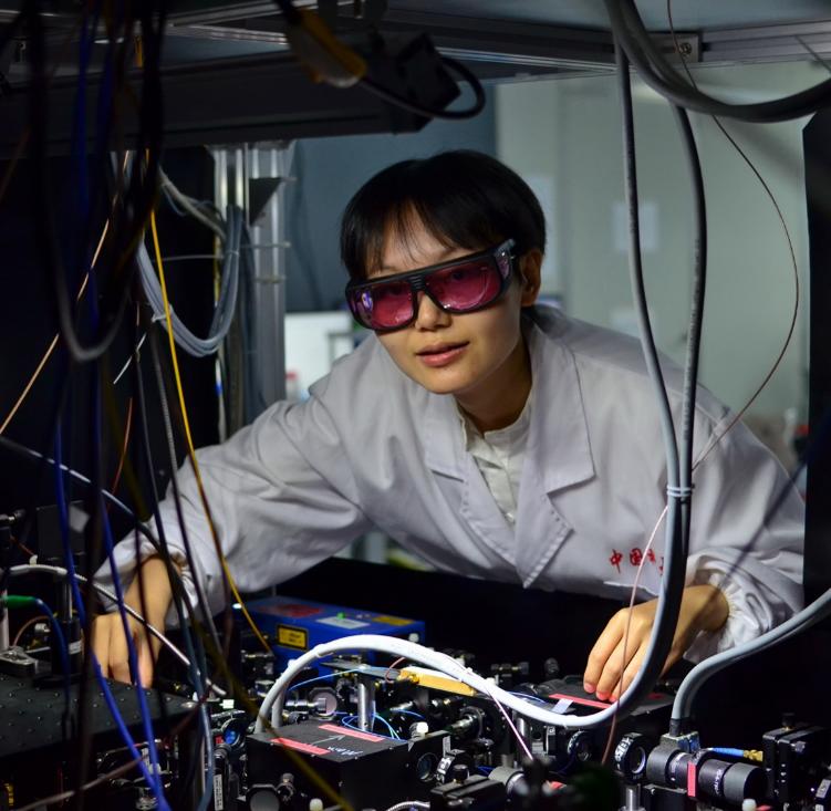 图 2 中科大研究生储艳清在调节氩-39原子阱激光系统。蒋蔚供图。