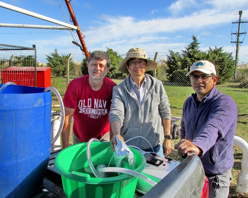 图 3 中科大蒋蔚教授与阿根廷同事在地下水采样现场。从左自右, Daniel Martinez,蒋蔚,Mauricio Quiroz。蒋蔚供图。