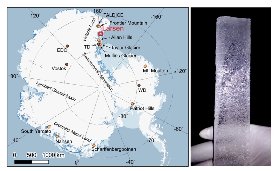 图 6 南极洲地图。拉森冰架位于红色方框处。右图为用来进行氪-81定年的蓝冰样品。图片取自Lee, G. et al., The Cryosphere 16, 2301 (2022)。