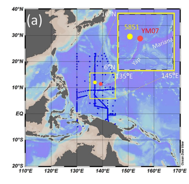 图 7 西太平洋的雅浦-马里亚纳海沟,橙色点标出了氩-39海水定年研究的采样站位。 图片取自Gu, J.-Q. et al., Journal of Geophysical Research: Oceans 127, e2022JC018417 (2022).
