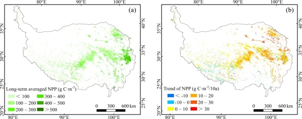 图1 青藏高原沼泽湿地植被多年平均NPP及变化趋势(2000年至2020年)