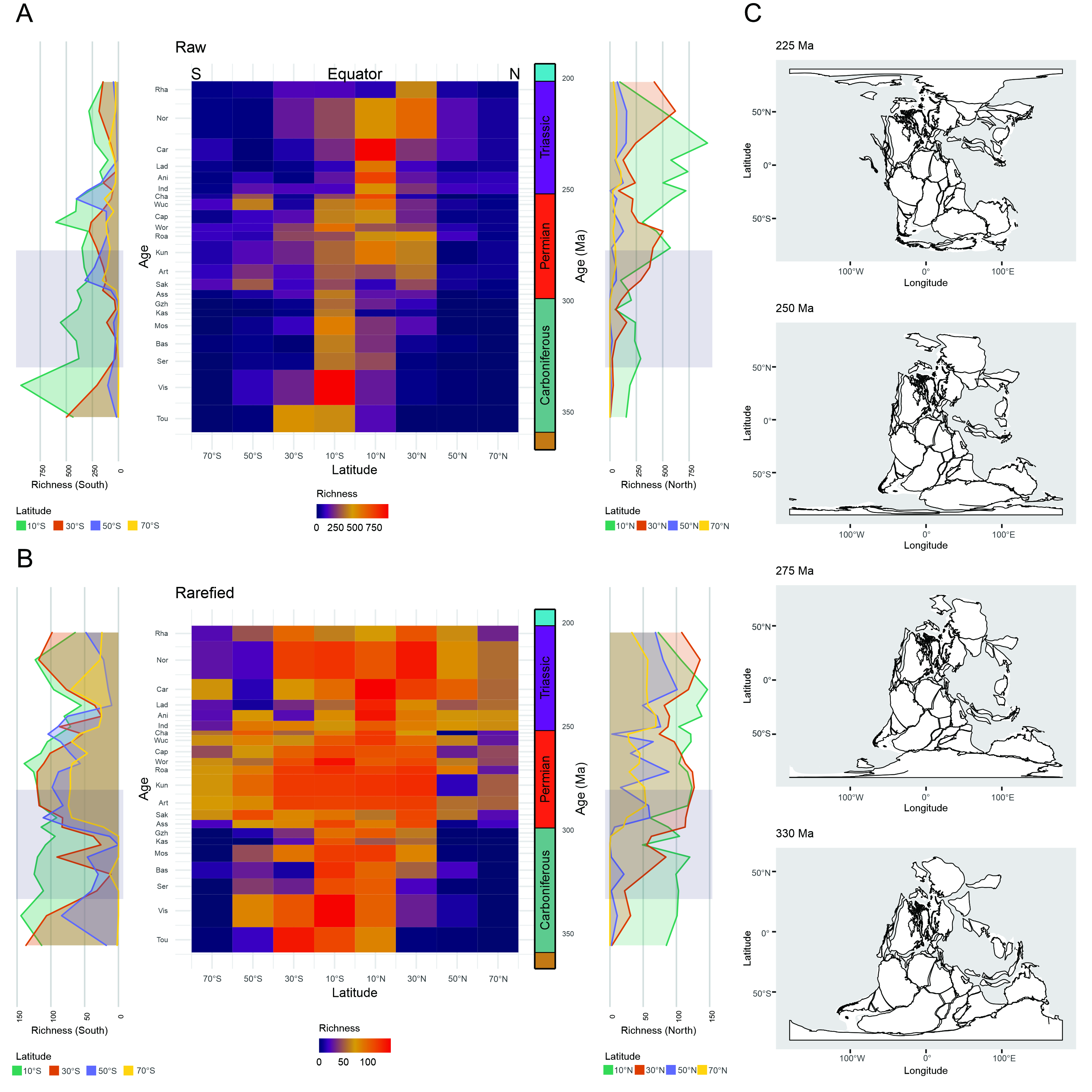 图1 石炭纪至三叠纪(3.6-2.0亿年前)海洋无脊椎动物纬向多样性梯度模式(A,原始数据;B,标准化结果)指示当时全球生物多样性中心向北转移及古板块向北移动的过程(C)。