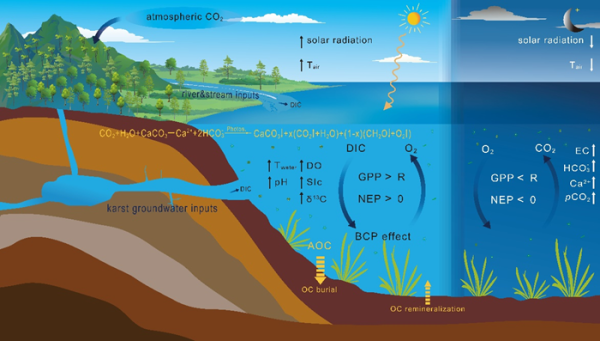 当前,全球CO2高排放量引发的气候危机受到高度关注,急需采取行动以降低碳排放或寻找新的碳汇途径。此前研究证实,“耦联水生光合作用的碳酸盐风化”(CCW)是重要的碳汇机制,全球推演发现其规模可能与海洋、森林碳汇在一个数量级。该碳汇机制主要基于DIC在水生生态系统中可以部分地被水生光养生物利用并产生内源有机碳(AOC)汇,使碳酸盐矿物在沉淀过程中产生的CO2并未完全脱气至大气,实现大气CO2的捕获与稳定。然而,由于缺乏相关过程的精细刻画,该机制对水体尤其是高DIC水体碳循环的潜在影响知之甚少,限制了准确评估与预测碳汇规模的能力。