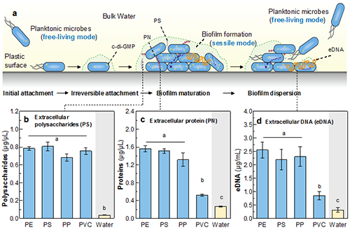 图1 塑料表面生物形成过程(a)和胞外聚合物成分含量(b-d)