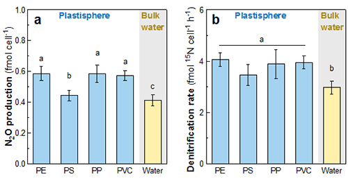 朱永官团队研究发现,塑料际生物膜的形成、扩散以及胞外聚合物浓度等都具有其显著特征,形成了有利于反硝化过程的厌氧条件(图1);从而使得河口塑料际具有较高的反硝化活性和强温室气体N2O释放能力,高于周围水体释放N2O的1.5 ~ 2倍(图2);这些温室气体的释放过程是主要由细菌和真菌介导的反硝化过程。与周围水体相比,塑料际表面的反硝化微生物群落具有较高生态位宽度和重叠率,并且呈现出不同的反硝化功能核心物种。这些结果对于深入理解和评估漂浮在水体(海洋系统)中塑料碎片的生态作用和环境效应具有重要意义。
