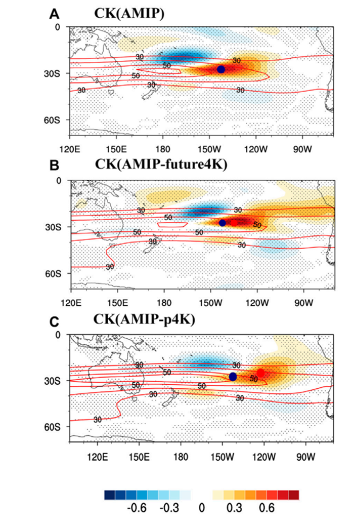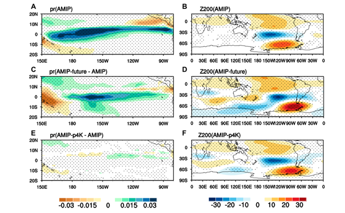 在全球变暖背景下,ENSO遥相关会如何变化?有研究提出,厄尔尼诺型海洋增暖背景下ENSO激发的热带太平洋降水异常东移,导致未来ENSO遥相关向东移动。除与热带降水异常有关之外,ENSO遥相关也受到热带外大气背景流场的影响。中国科公司大气物理研究所研究员黄刚团队前期工作发现,副热带急流的差异对遥相关的非对称性有重要贡献。基于这一思路,研究使用CFMIP中的系列AMIP实验发现,考虑厄尔尼诺增暖型的作用,AMIP-future4K实验可较好地复现出CMIP实验中南半球ENSO遥相关的东移。即使不考虑海洋增暖模态的作用,仅使用均匀增暖海温强迫(AMIP-p4K实验),遥相关仍会东移。