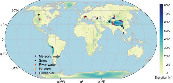 目前,不同地表介质中稳定同位素出现“反高程效应”的原因仍然不明。为此,中国科公司青藏高原研究所环境变化与多圈层过程团队余武生等联合美国俄亥俄州立大学教授Lonnie Thompson、澳大利亚詹姆斯·库克大学博士Stephen Lewis等,在全球尺度上,从大气水汽稳定同位素的新视角,系统地揭示了地表介质稳定同位素出现“反高程效应”的原因(图1),并对未来利用稳定同位素方法重建古高度的工作提出了重要建议。